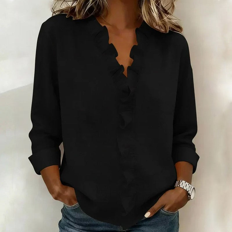This women’s blouse is styled with a ruffled V-neck detail that highlights the neckline and brings soft structure to the front. The relaxed fit and simple sleeves keep the silhouette effortless and versatile for daily wear.
