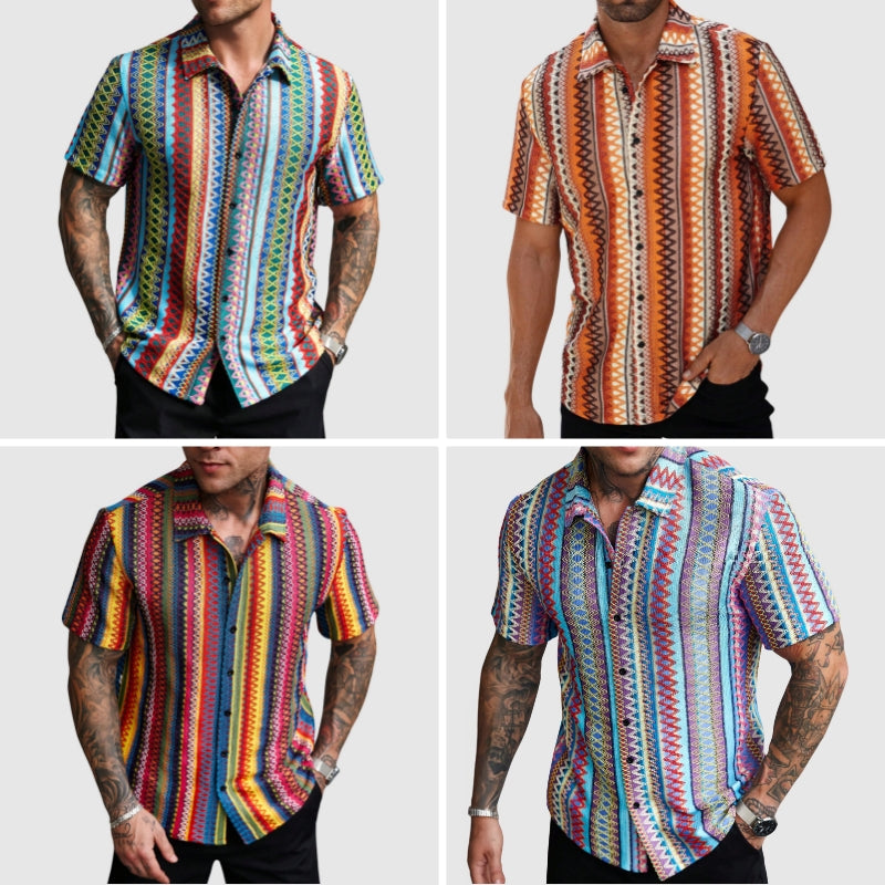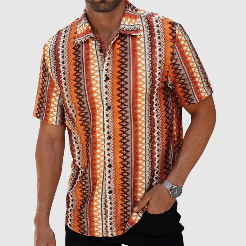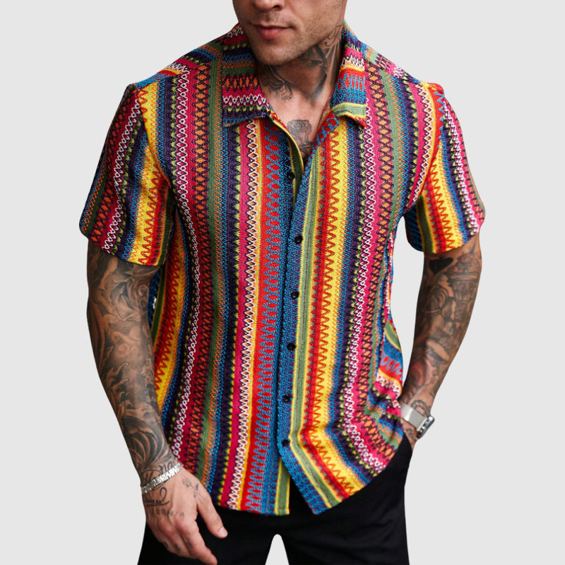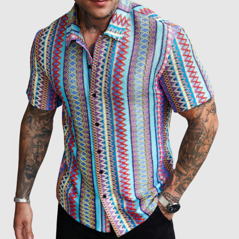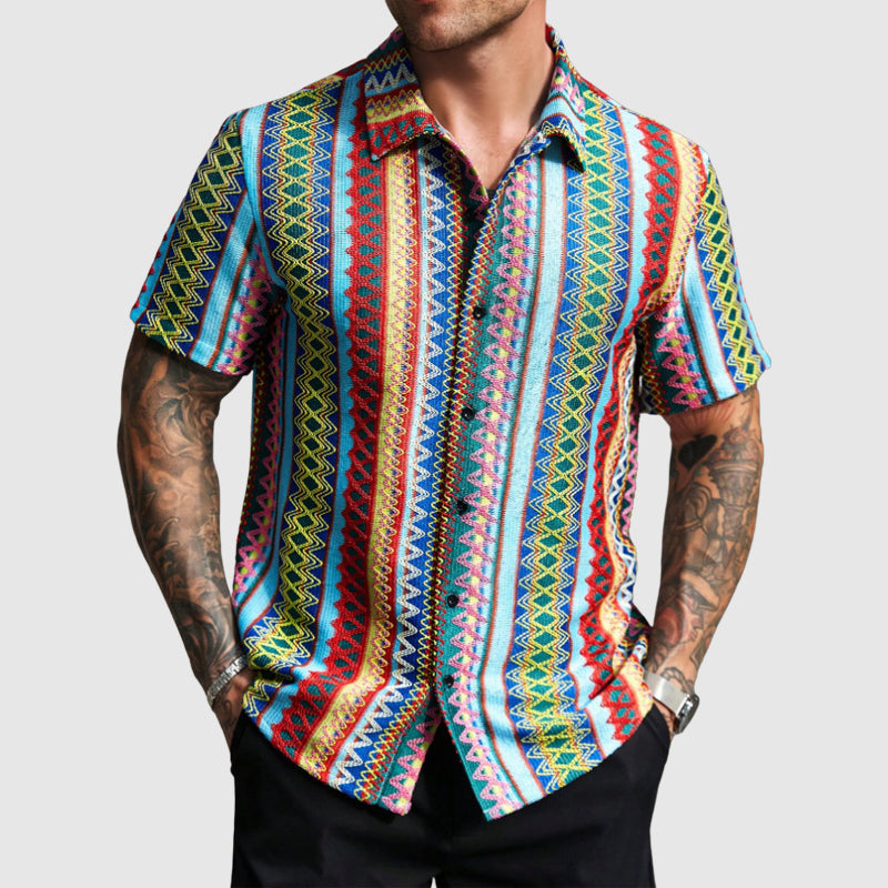 Dare to wear bold. Featuring an energetic mix of colors in a geometric woven pattern, this short-sleeve shirt is an easy way to elevate your warm-weather wardrobe. Finished with a relaxed collar and a casual drape, the Blue Ridge Shirt is a vibrant, retro-style button-up that merges cultural heritage with contemporary flair.