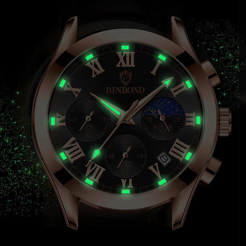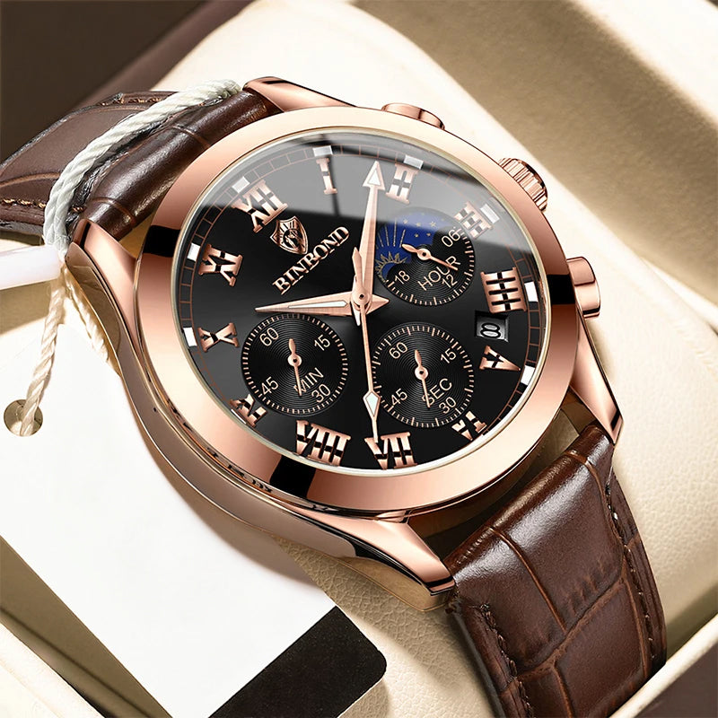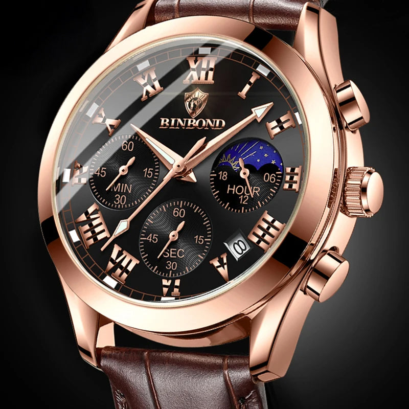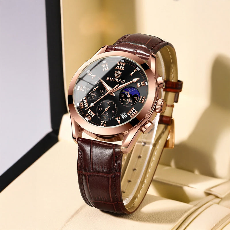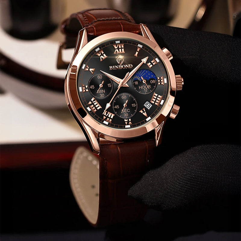 Jack Washington Grandeur Timepiece's rose gold case frames a deep obsidian dial, where Roman numerals, moonphase detail, and multi-function subdials converge in a symphony of refined utility. Paired with a rich brown alligator-textured leather strap, this watch evokes old-world elegance—while luminous hands and sleek chronograph design ensure it’s firmly in the present.