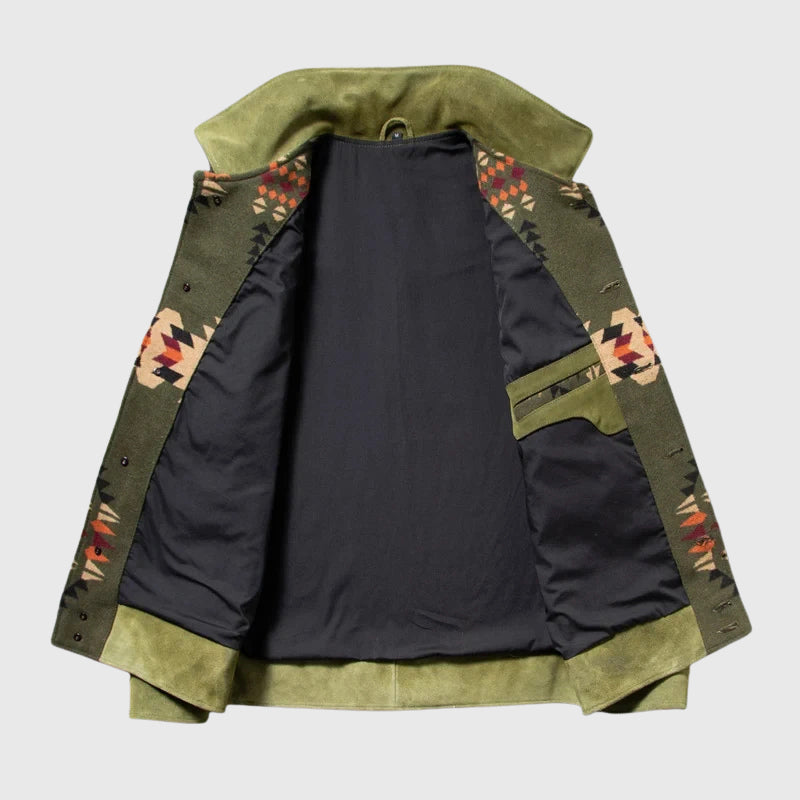 With a commanding presence and meticulous detailing, this jacket is tailored for the man who leads with intention. Distinctive fabric paneling across the chest and back transforms its classic cut into a bold expression of personal style and character.