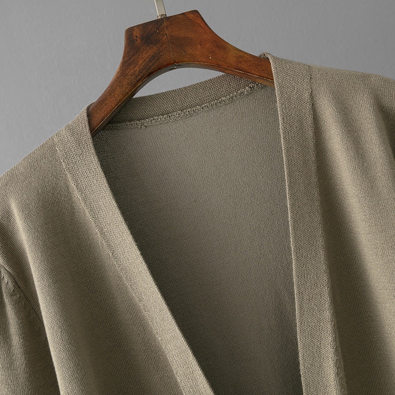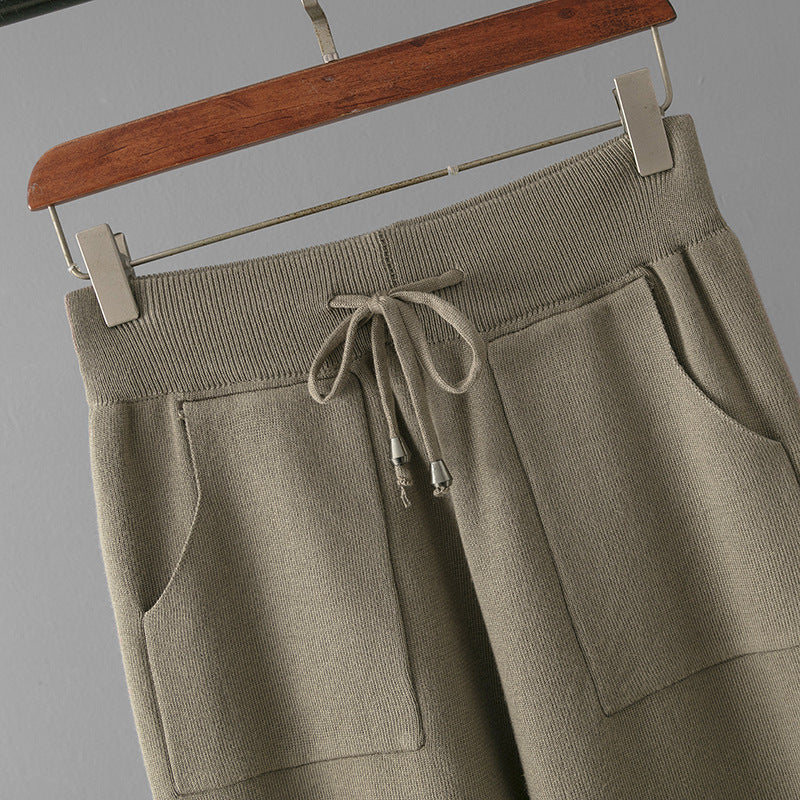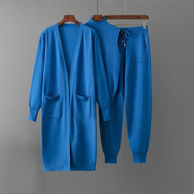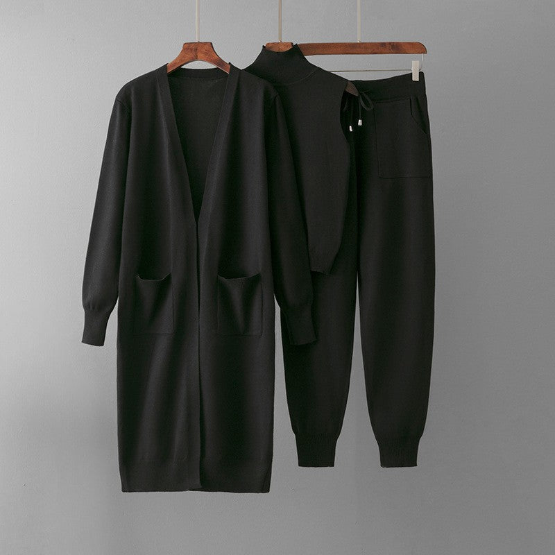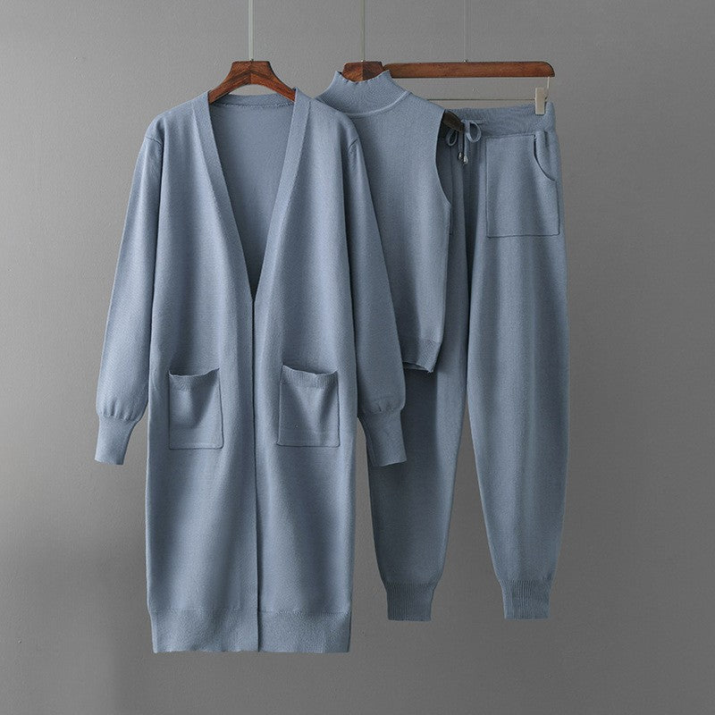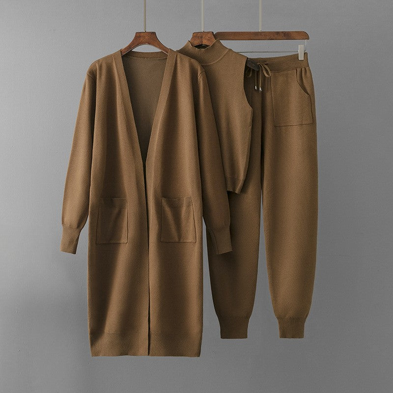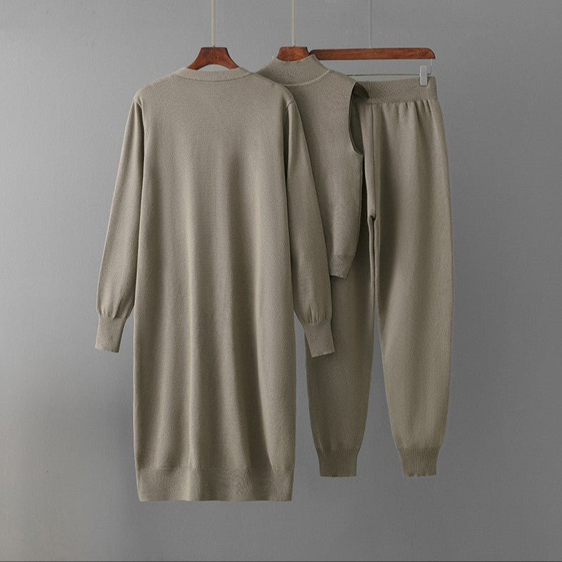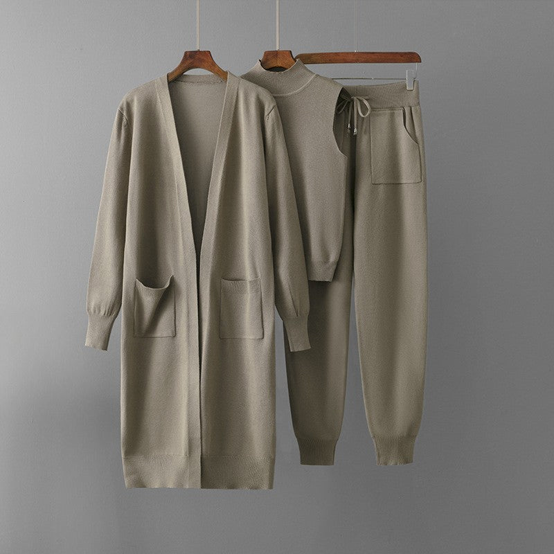 - The set contains: a long cardigan, a sleeveless top, and wide-leg trousers