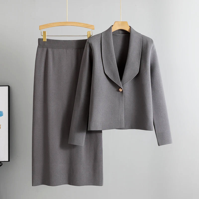 - The set includes: A relaxed blazer and form-skimming skirt
