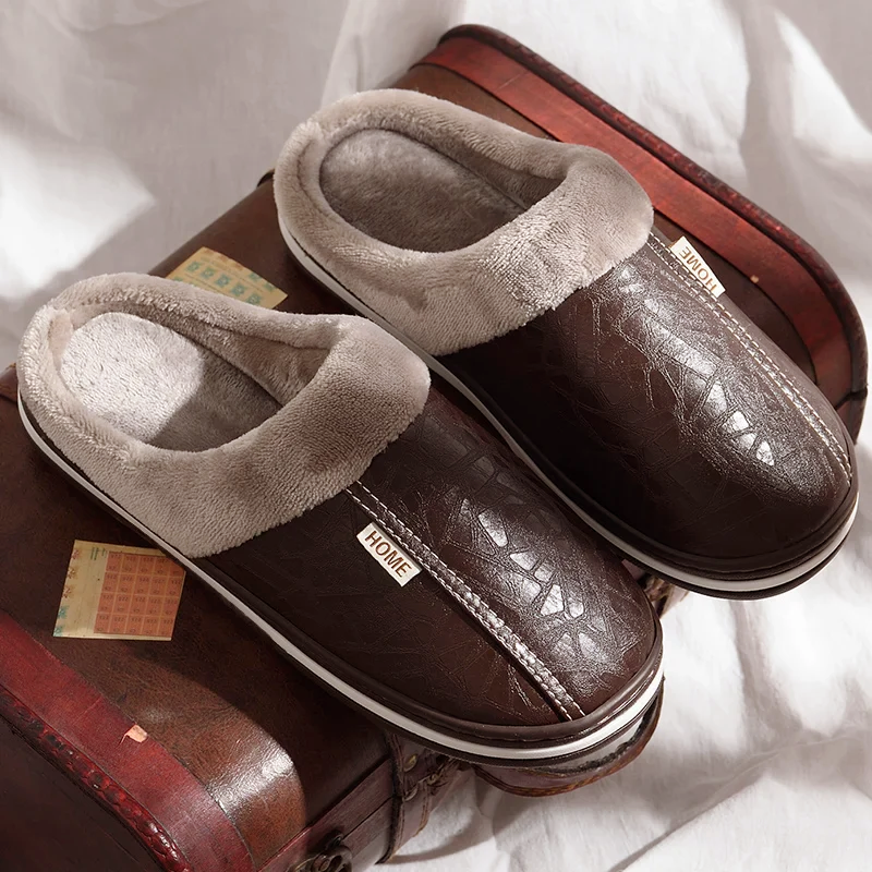 - 1× Pair of men’s waterproof PU leather slippers with fleece lining