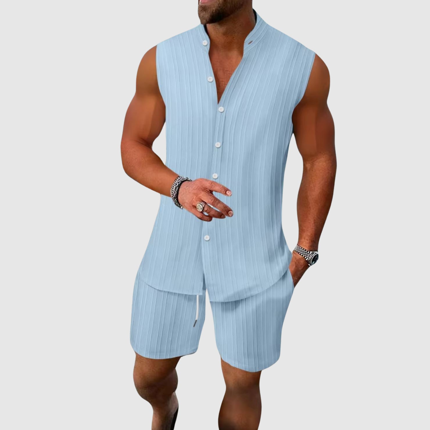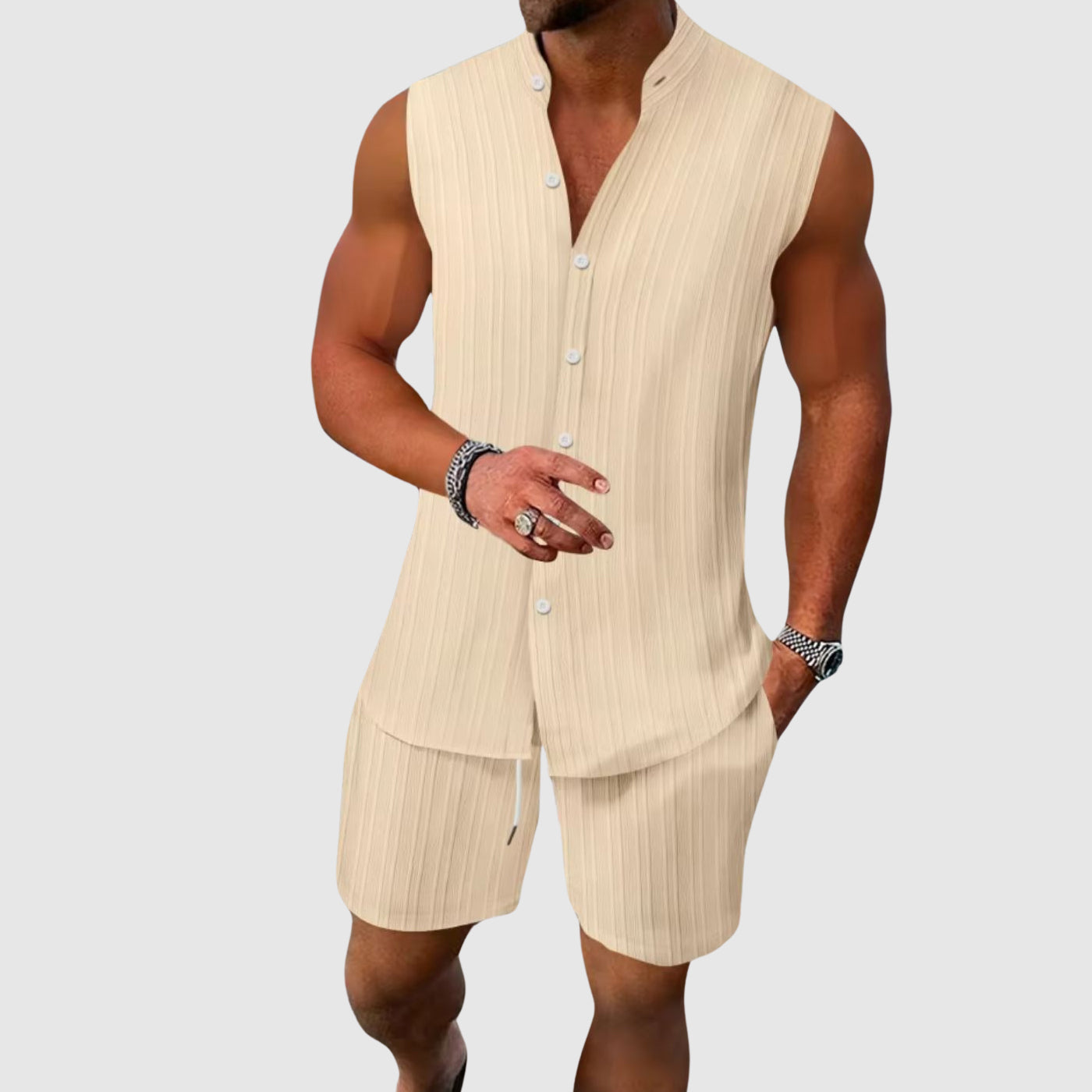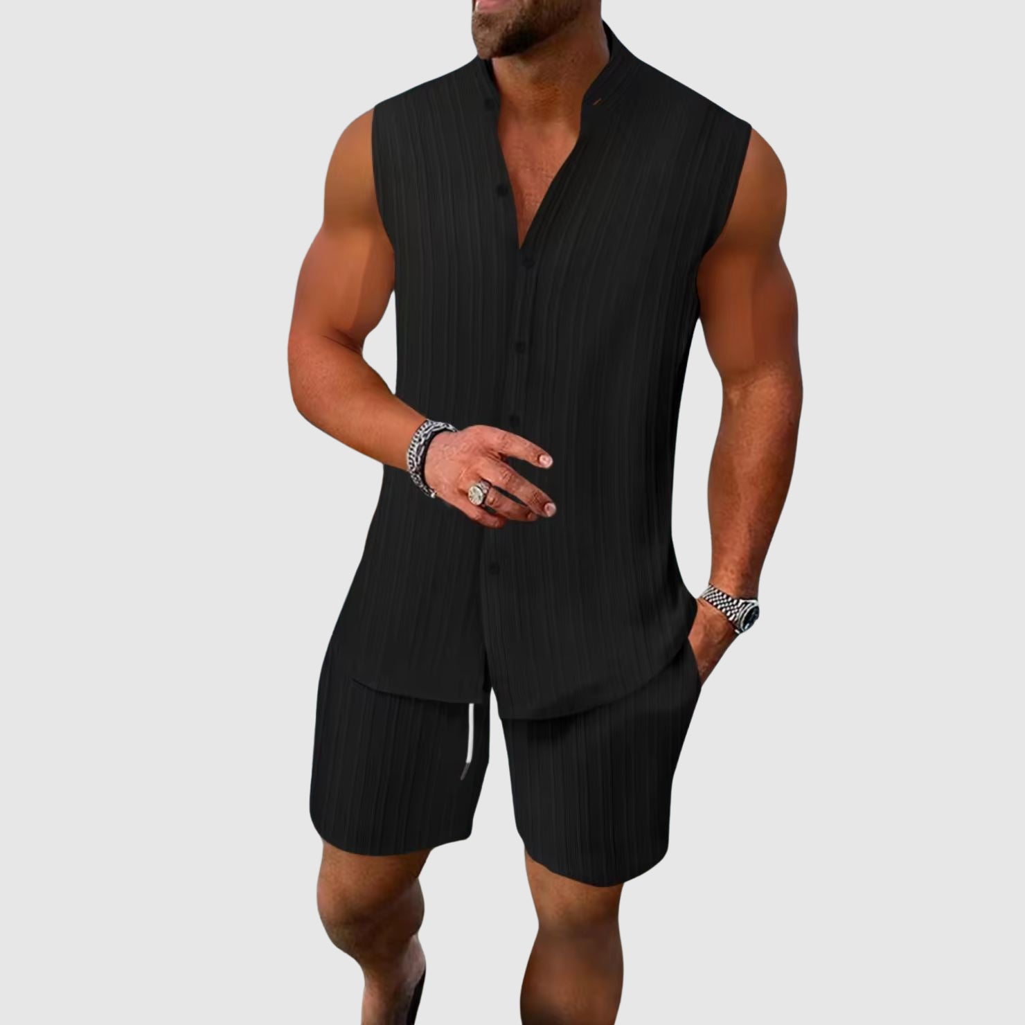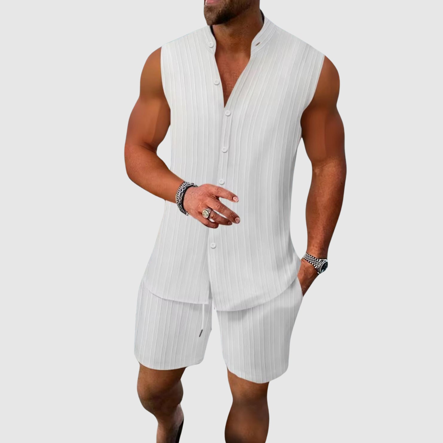 - Set includes: Sleveless vest and same-colored pants with drawstring closure