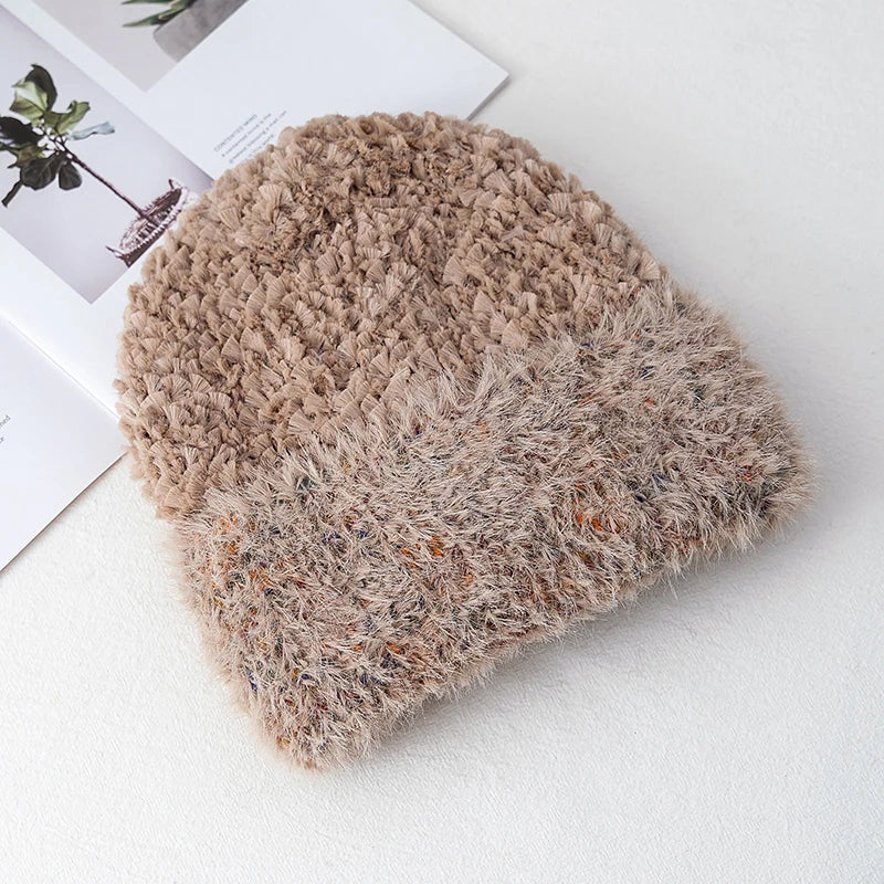 This beanie features a plush faux fur exterior with a fluffy finish for a feminine winter look. Designed for cold seasons, it complements coats and layered outfits with a gentle, winter-ready appearance.
